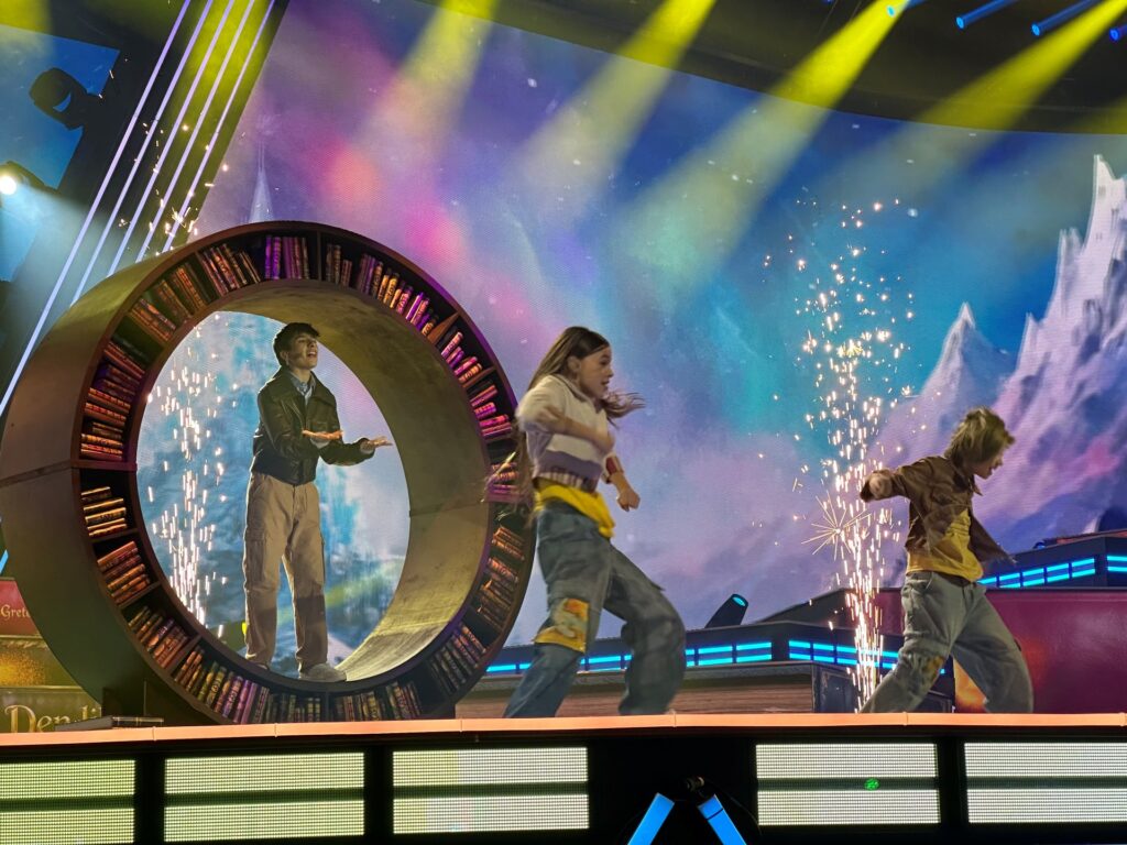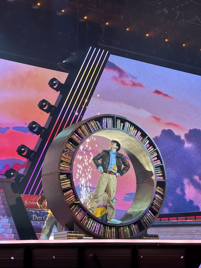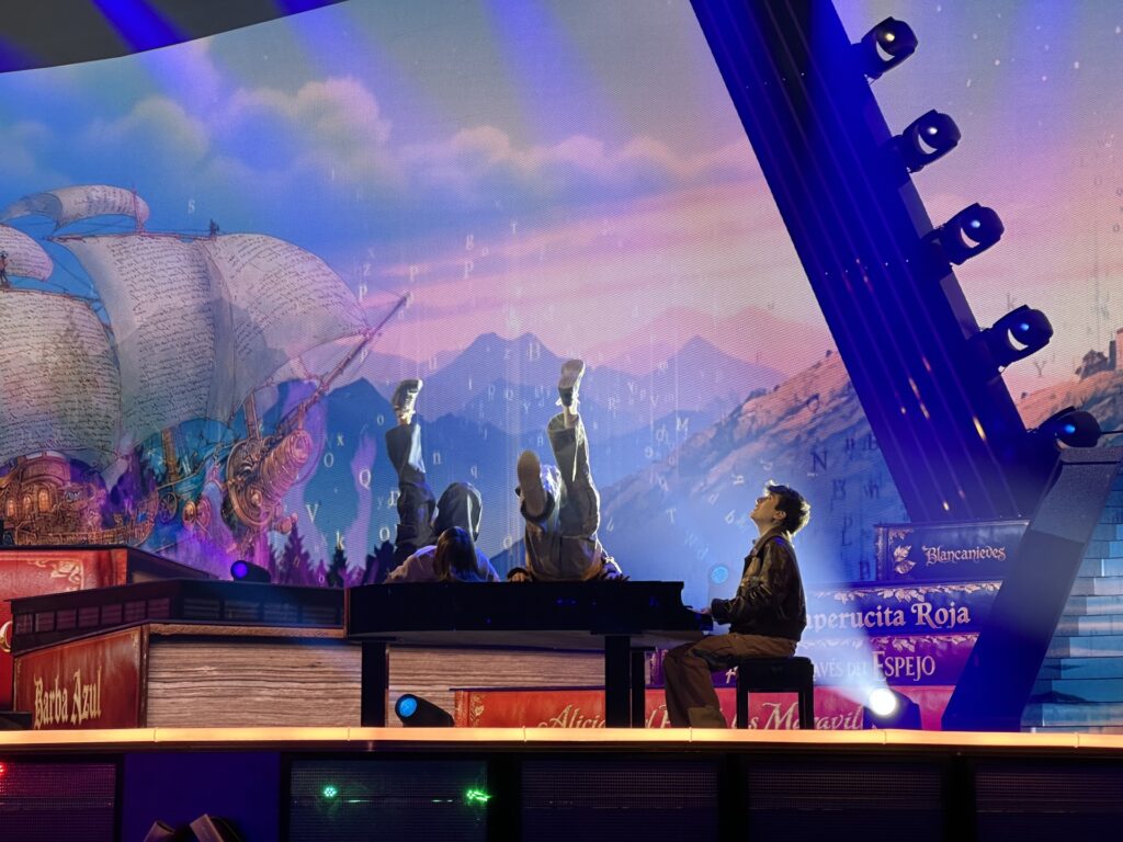 La puesta en escena de la actuación se articula en tres actos: un inicio íntimo de Gonzalo al piano, una transición hacia la energía compartida con sus bailarines al sumergirse en la lectura, y un final en el que la magia de los libros, la fantasía y el teatro musical se combinan con la coreografía y efectos visuales inmersivos.